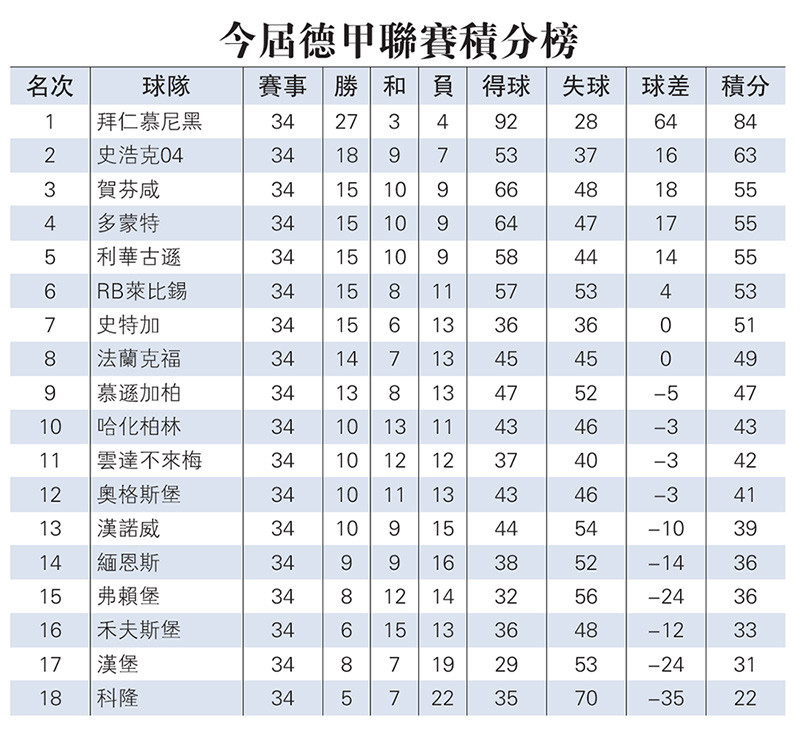 今屆德甲聯賽積分榜