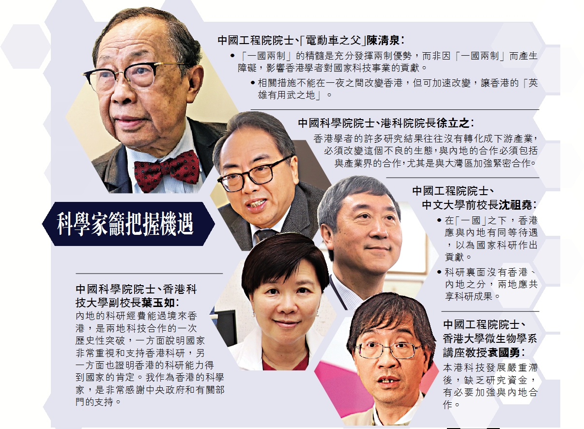 24名在港兩院院士去年六月就香港科研發展情況聯署致函國家主席習近平,得到習近平的高度重視並作出重要批示,參與聯署的院士倍感振奮。聯署發起人、中國工程院院士、有「電動車之父」之稱的陳清泉昨日表示,國家科研項目經費可以過境香港使用,突顯了國家高度重視香港創科發展,充分顯示「一國兩制」下,內地與香港是一家人,攜手促進國家創科發展,更可令香港學者「英雄有用武之地」。/大公報記者 朱樂怡 趙凱瑩 朱晉科 劉家莉