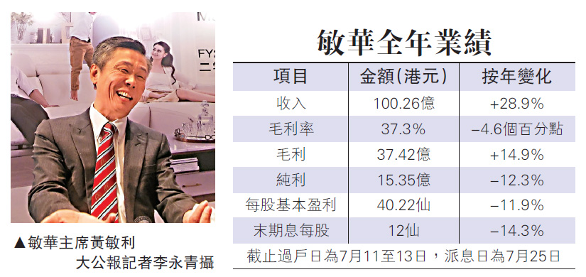 【大公報訊】記者李永青報道:受人民幣升值及原材料漲價影響,敏華控股(01999)於2018財年純利按年跌12.3%至15.35億元,每股盈利40.22仙,派末期息0.12元。主席黃敏利表示,料今年鋼鐵和包裝紙價格趨平穩,再漲價空間有限,但海運和化學品成本變動則較難預測,因為受制於中東局勢等政治因素。匯率方面,人民幣於過去一年兌美元升值8%後,未來走勢亦難以預測。