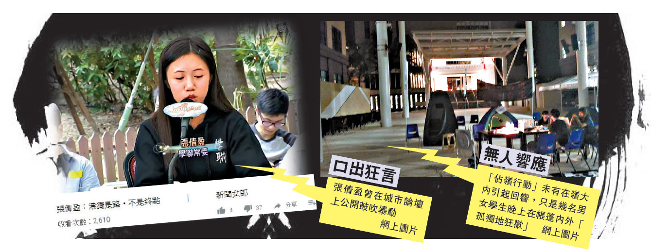 不僅如此,曾任嶺南大學學生會外務副主席的張倩盈,去年為吸引眼球,效仿違法「佔中」,以組織「嶺事館」的名義發起「佔嶺行動」(意為佔領嶺南大學),抗議反「港獨」言論。但「佔嶺行動」在嶺南大學亦未能引起任何回響。一幅當時的相片顯示,張倩盈與另兩名屬「嶺事館」成員的男子,並肩坐在帳篷前,進行所謂的抗議行動,身後的大片校園空地上,不見其他人影。那一夜,只有兩男一女和一頂帳篷。就算「嶺事館」曾舉辦的公開論壇,也只有寥寥數人參與,現場以空櫈居多。