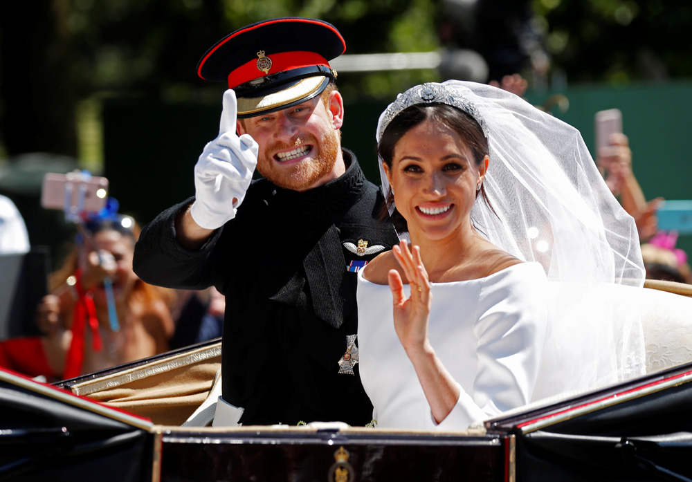 圖:哈里王子和梅根乘坐馬車巡遊,接受民眾祝福\法新社