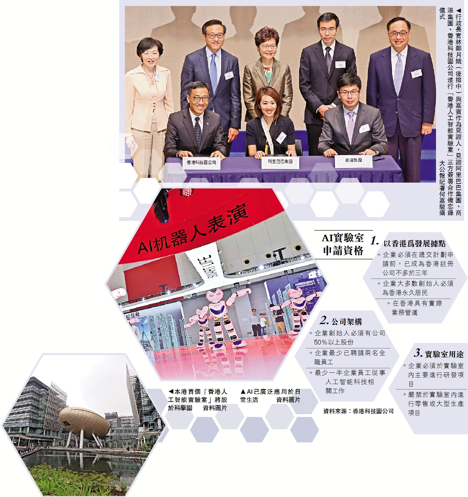 圖:行政長官林鄭月娥(後排中)與嘉賓作為見證人,見證阿里巴巴集團、商湯集團、香港科技園公司進行「香港人工智能實驗室」三方簽署合作備忘錄儀式/大公報記者何嘉駿攝