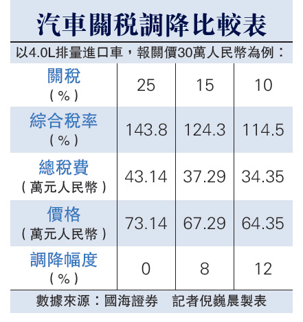 此次降稅後,關稅稅率降為15%,該款進口車將徵收關稅3.6萬元,相比降稅前減少2.4萬元。