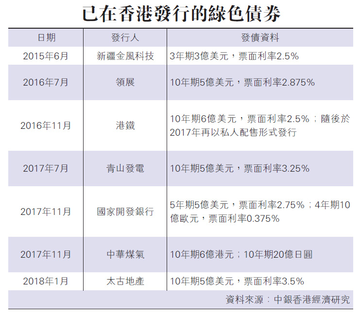 香港的綠色債券市場仍待發展。第一,市場規模細小,2017年的綠色債券發行規模只有23億美元。第二,發行主體相對單一,以本地機構較多,包括領展、港鐵公司、青山發電、中華煤氣和太古地產;另外,內地的風力發電公司新疆金風科技,以及國家開發銀行亦曾在香港發行綠色債券。第三,在港發行的綠色債券幣種覆蓋國際主要貨幣,並以美元為主。