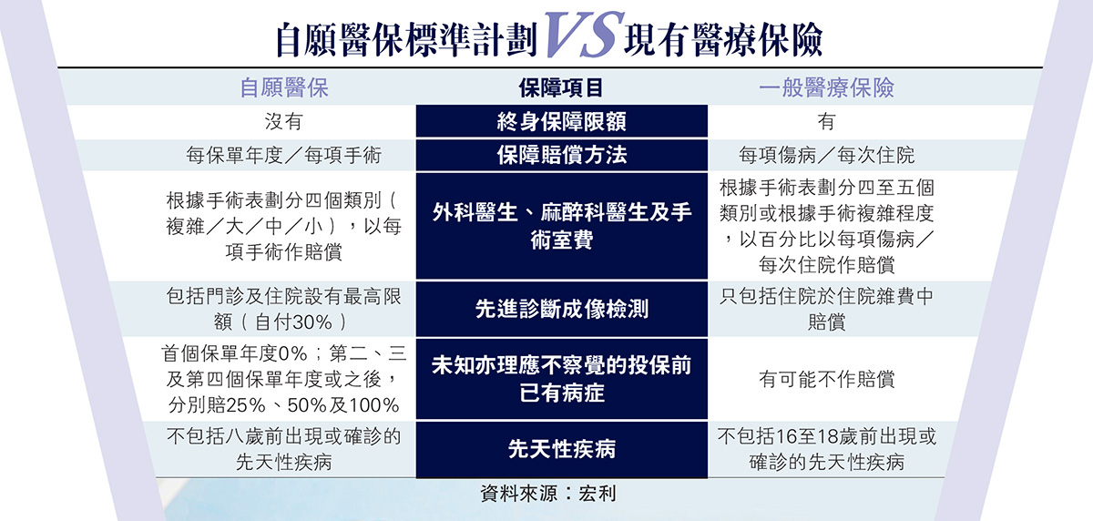 自願醫保下有兩類認可產品,一是標準計劃,即自願醫保的最低要求;二是靈活計劃,即保障或條款較標準計劃更好。投保人須為持有香港身份證人士,年齡介乎15至80歲。自願醫保與市場現時的醫療保險計劃,最大不同之處,就是保證續保至100歲,不設終身保障限額,並承保未知的投保前已有病症等。不過,政府是次未有設立「高風險池」,市場預期長者購買自願醫保的人數有限。