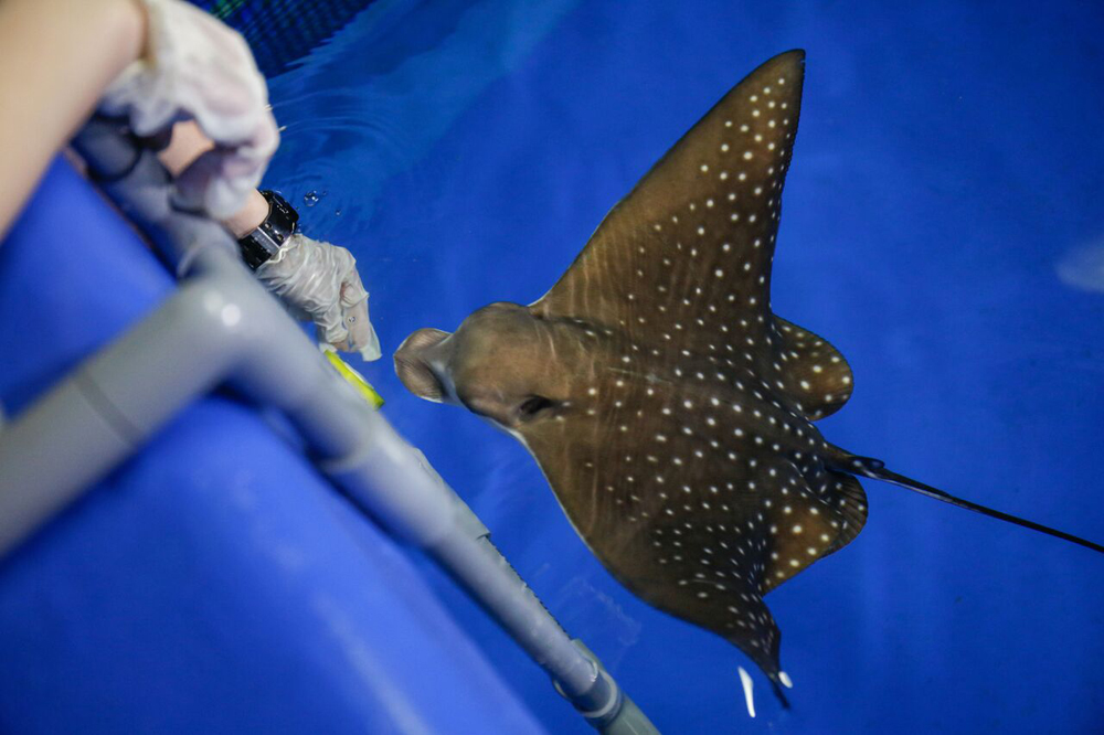 圖:全港首對港產龍鳳胎魔鬼魚BB亮相。圖為女BB點點正進行護理培訓,看來樂趣無窮\海洋公園圖片