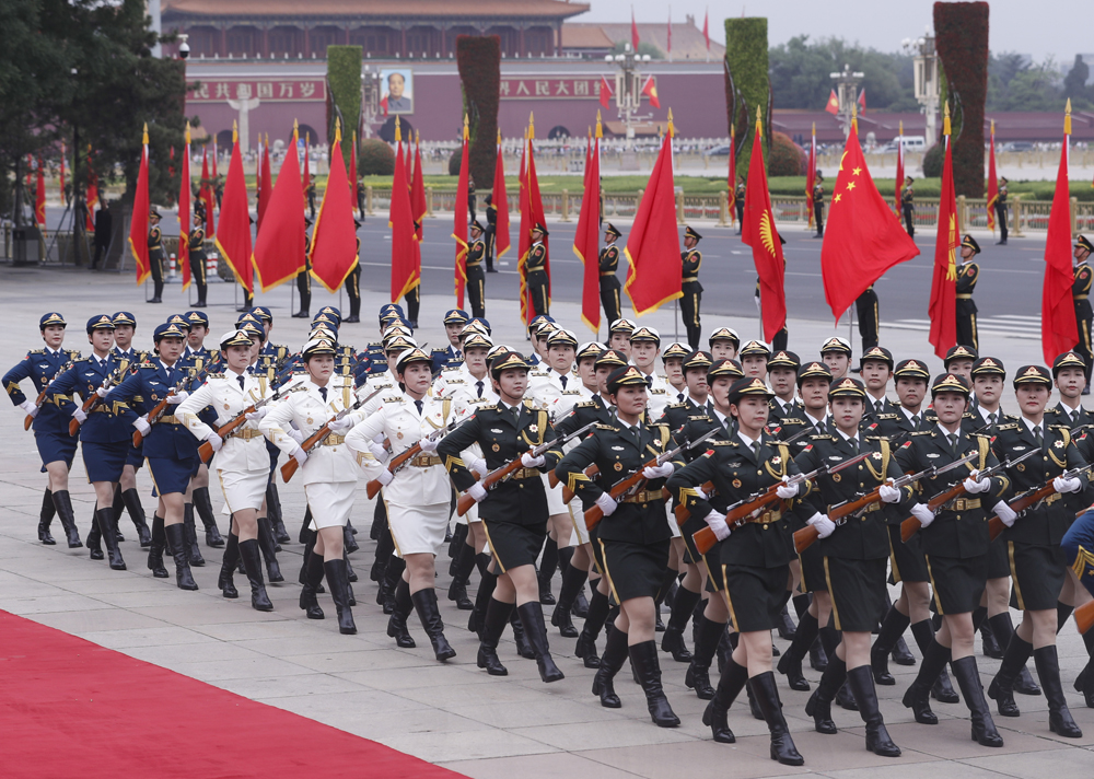 【大公報訊】綜合新華社、中新社報道:6日下午,中國國家主席習近平在人民大會堂東門外廣場舉行儀式,歡迎來華進行國事訪問的吉爾吉斯斯坦總統熱恩別科夫。與此前相比,歡迎儀式多項內容發生了新變化,包括三軍儀仗隊首次增加女兵方陣等,讓人眼前一亮。這是經過改革後國事訪問歡迎儀式的首次啟用,充分展示了新時代大國外交新氣象、新作為。