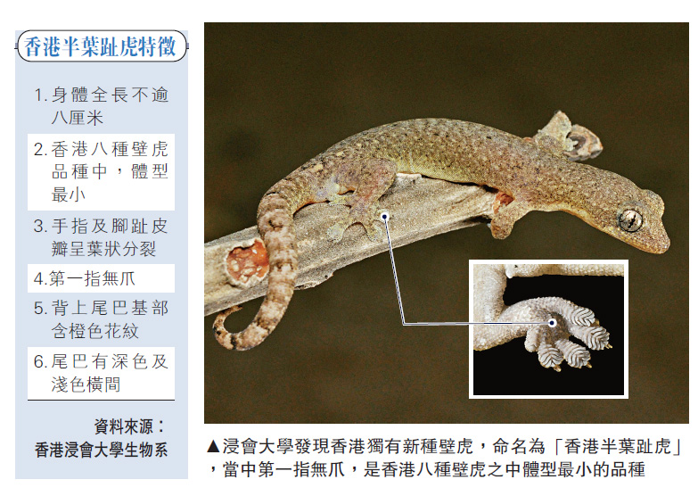 圖:浸會大學發現香港獨有新種壁虎,命名為「香港半葉趾虎」,當中第一指無爪,是香港八種壁虎之中體型最小的品種