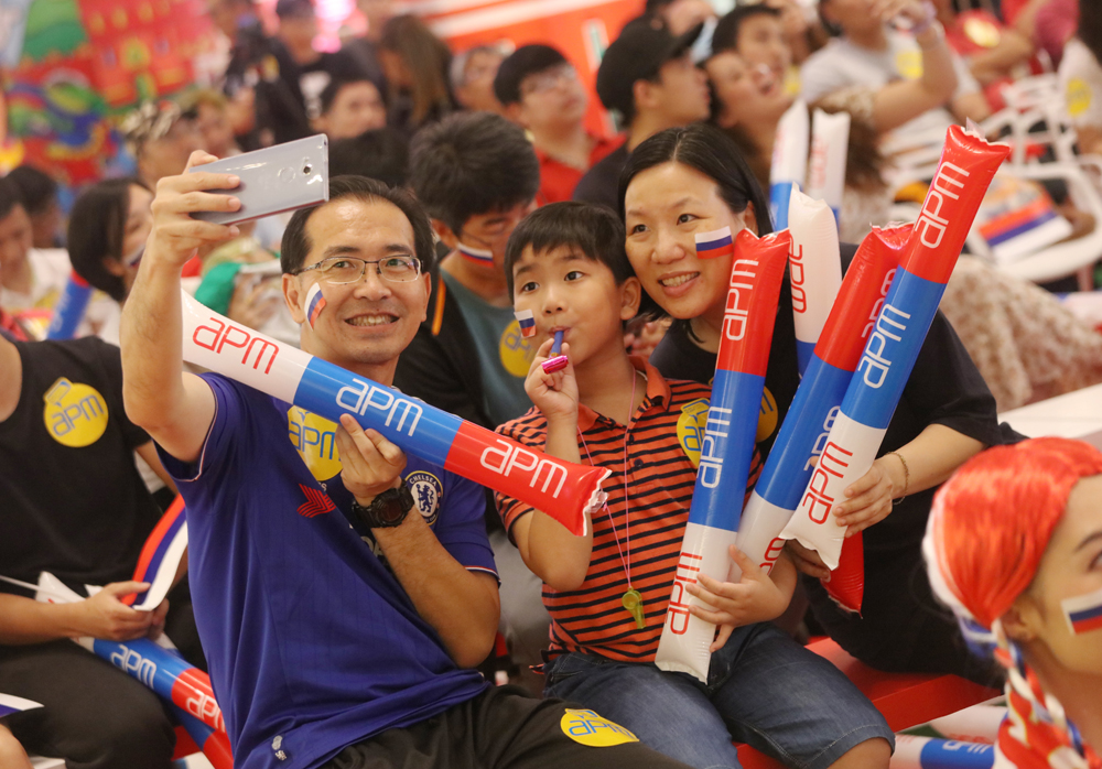 圖:商場提供賽事直播,每逢有精彩鏡頭,大家「瘋狂」舞動打氣棒。一家三口歡呼之餘,不忘自拍/大公報記者林少權(圖)