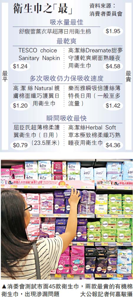 「貴嘢」未必好,尤其在女士月經到來的日子更要小心選擇!消費者委員會測試市面45款衛生巾,兩款最貴的有機棉衛生巾,竟然出現滲漏問題;吸水量最高的衛生巾,每片售價較吸水量最低的衛生巾便宜六成。測試又發現,最乾爽的衛生巾表層通常是網面、不織布和棉柔物料,但衛生巾在多次吸收後,吸收速度和表面乾爽未必可以兼得。