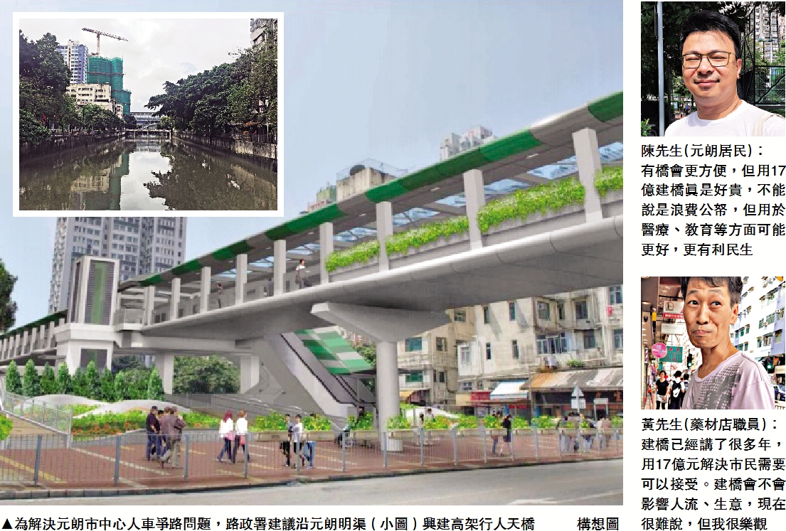 「天價17億」的元朗行人天橋惹來爭議,四大建築專業學會罕有地表明反對立場,認為在明渠上興建天橋是逆世界建築潮流,也違背政府推動的親水文化,強調建天橋非解決人車爭路的唯一方案,質疑「為了慳一億(元),將西九的地標天橋『剝光豬』,但用17億(元)在元朗建一條逆世界潮流的巨型天橋?」立法會議員要求政府設法降低造價;建測規園界議員認為,城市需要更多的呼吸空間,要求政府重新考慮學會方案的可取之處。/大公報記者 曾敏捷