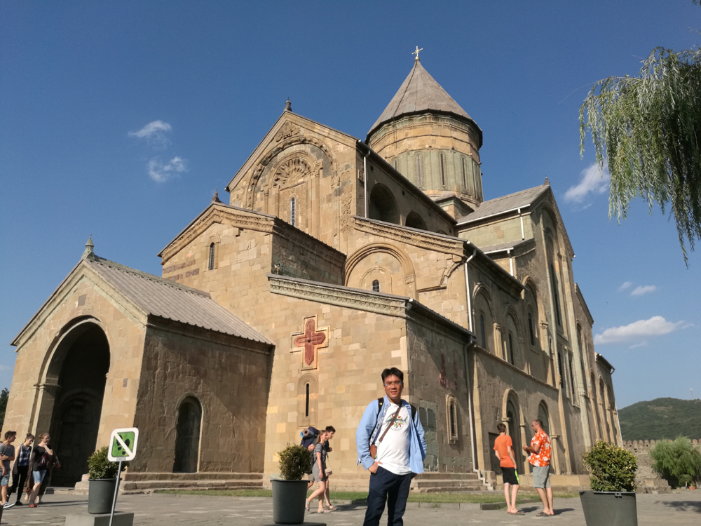 從納里卡拉城堡一步一步下山,沿路傾斜得很,且道路極為濕滑,容易跌倒。下山後,隨便攔截一輛的士,經議價後到距離第比利斯三十公里以外的姆茨赫塔古城(Mtskheta)。這裏有兩座著名的古老東正教堂,一座建於古城旁邊的山上,名叫十字修道院(Jvari Monastery);另一座則坐落在古城的中央,名叫生命之柱主教座堂(Svetitskhoveli Cathedral)。先到山上參觀十字修道院,它建於公元六世紀,據說,當時聖人打算在山頂上建立修道院,認為在這裏可透過神跡幫人醫治百病,後來吸引了多人前來造訪。到了蘇聯時期,修道院成為一個重要的文物保護單位,但因距離重要軍事基地而遭關閉,直到格魯吉亞獨立後,修道院重開。在風和日麗的晴天,在修道院所處的山頂上遠望Mtsvardi河跟Jvari河的交叉點,景色十分優美。