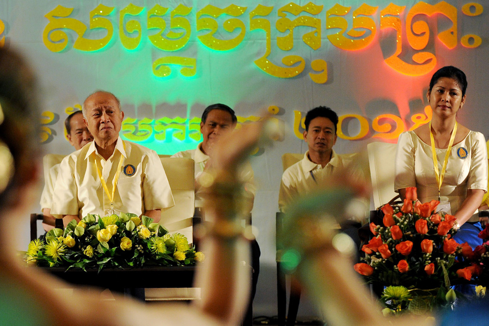 圖:2015年,拉那烈親王(前排左)與奧波拉王妃(前排右)在奉黨會議期間觀賞表演 /資料圖片