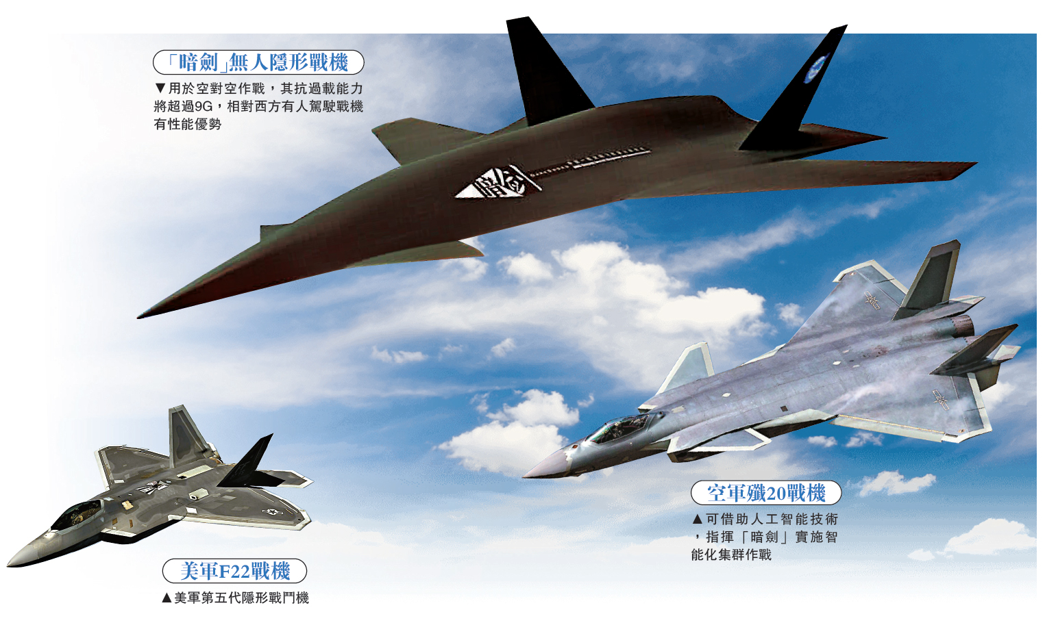 日前,一張「暗劍」無人戰鬥機全尺寸樣機的圖片出現在內地網絡上,在國內外媒體和國外防務智庫間引起巨大轟動。外界分析普遍認為,「暗劍」的外形設計與中國現役隱形戰機殲-20非常相似,性能指標可能與中國第五代戰機相當,其未來作戰半徑或可達1000公里。外媒預測,未來「暗劍」有可能攜帶中國最先進空空導彈,具備高超音速飛行能力,對東海、南海的「敵對武器平台」構成致命威脅,提升中國在東海、南海的「區域拒止」能力。/大公報記者 葛 沖