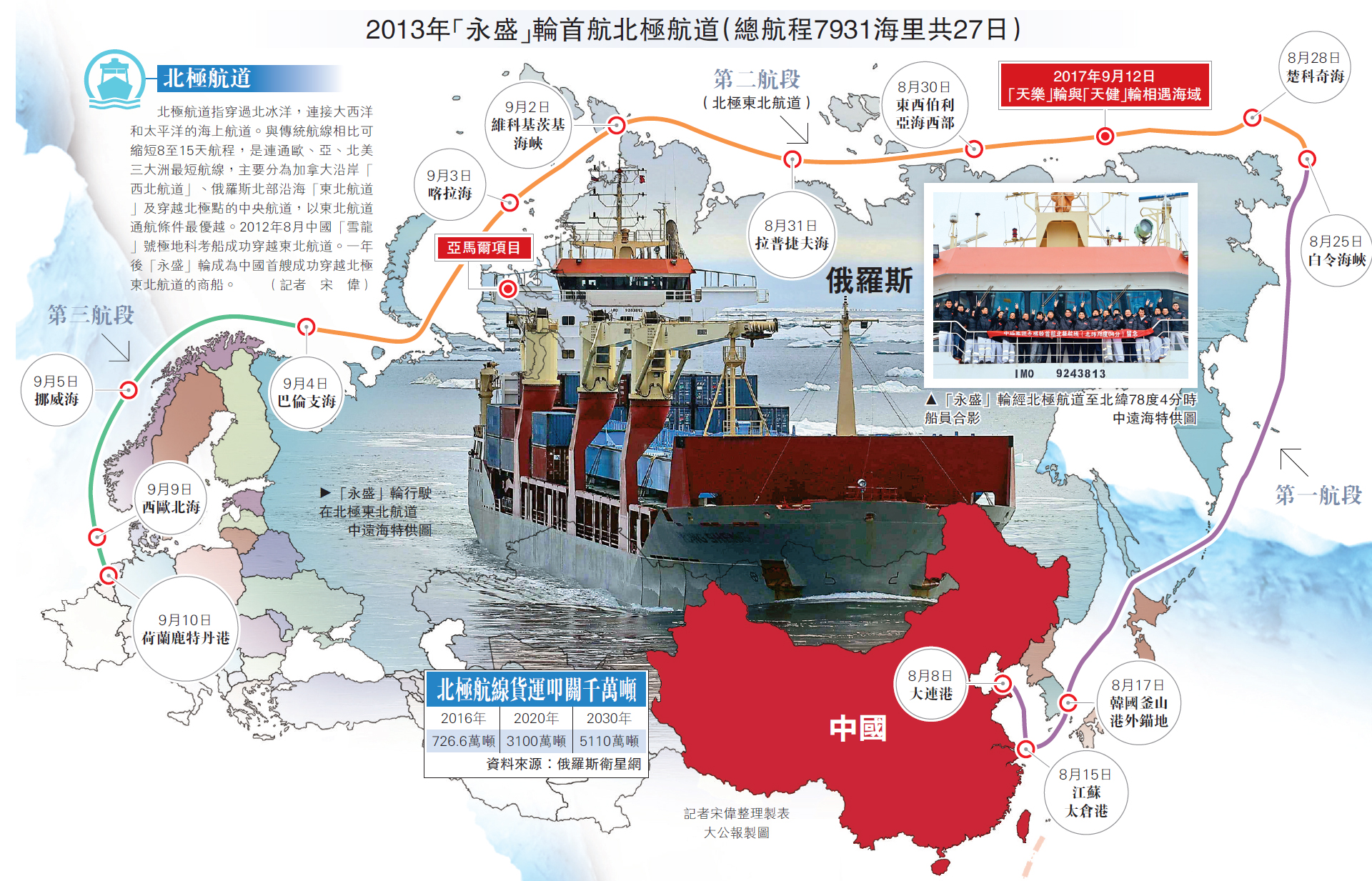 亞馬爾半島在涅涅茨語中意為「土地的盡頭」,位於俄羅斯西伯利亞平原西北部,臨近北極。「祥雲口」輪是中遠第3艘自東往西穿越北極東北航道的船舶。「2016年『祥雲口』航行北極東北航道時,船上承運的貨物是亞馬爾項目3個集成模塊,每個高近60米高,重近6000噸,總價值在人民幣億元以上。」時任「祥雲口」輪船長陳曉軍告訴大公報,該輪承運特殊高價值的貨物,對途中航線上的氣象要求有嚴格標準。