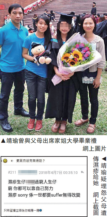 【大公報訊】記者黃俊華報道:疑因濕疹問題弒父殺母再自殺的少女彭靖瑜,行兇前曾在網上留言,表示「濕疹生仔X街過窮人生仔」,言詞似責怪父母將濕疹遺傳給她。警方正調查有關言論,是否倫常血案的殺人動機。