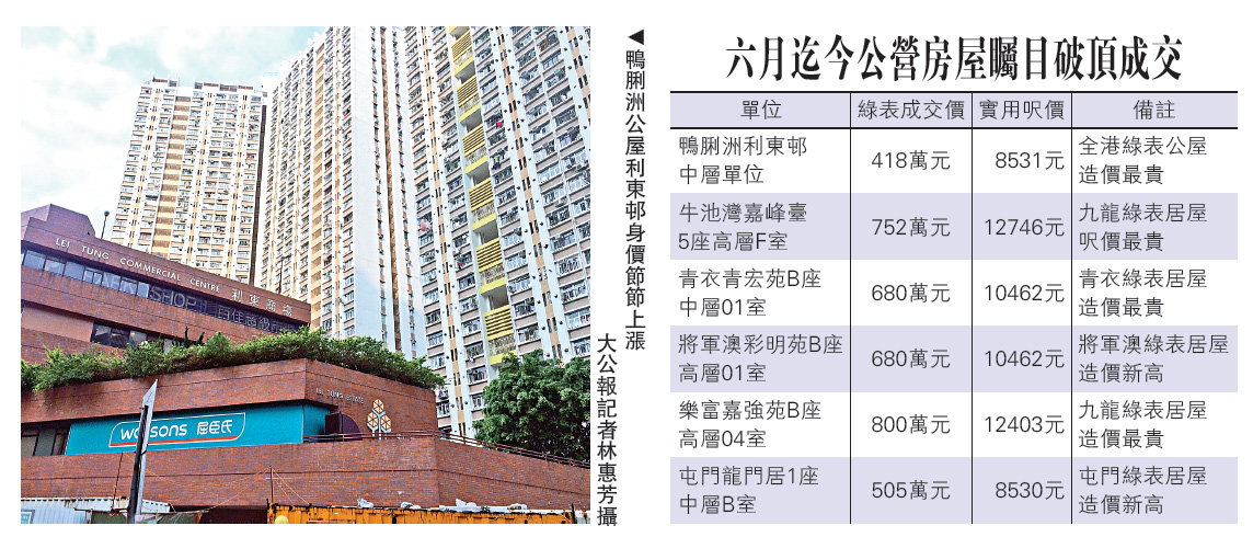 新居屋揀樓前夕,公營房屋輪流破頂,六月迄今最少錄26宗癲價成交,港島、九龍及新界齊誕樓王。當中,鴨脷洲利東邨未補價售418萬元,膺全港綠表公屋王;牛池灣居屋嘉峰臺呎售1.27萬則屬九龍區綠表居屋新高;另沙田居屋愉翠苑賣720萬元,貴絕全新界綠表居屋。/大公報記者 林惠芳