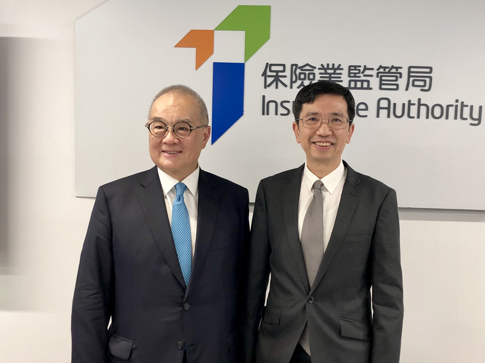 圖:保監局主席鄭慕智(左)表示,保監局正積極研究有關香港保險業於大灣區設立保險服務中心的細節;旁為行政總監梁志仁大公報記者邵淑芬攝
