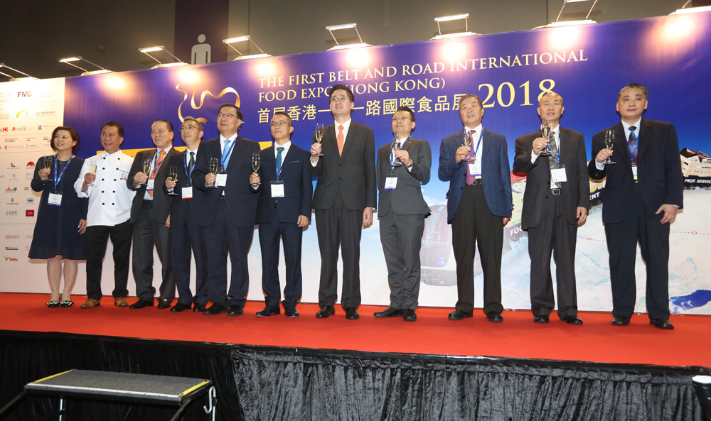 圖:首屆香港一帶一路國際食品展開幕典禮與會者合影。全國人大常委譚耀宗(左五)、中國雲南省副省長陳舜(左四)、香港一帶一路國際食品展組委會主席葉長春(左六)等出席開幕典禮 大公報記者林少權攝