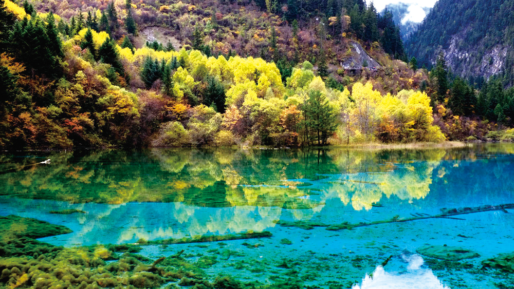 九寨溝海子水的綠寶石藍,顯然最讓人迷醉,那是水質、光線,還有化學物質等織就的藍,也是藍天上倒墜的影子。