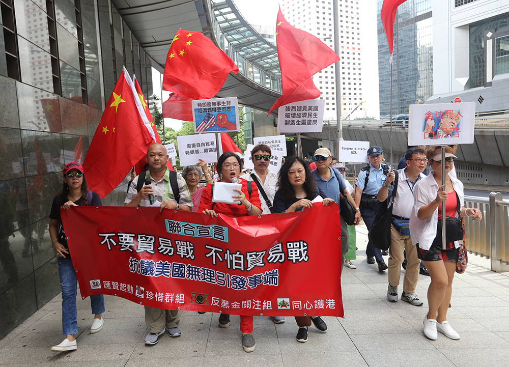 珍惜群組、同心護港、匯賢起動、反黑金反「港獨」關注組近50名成員,昨日下午從中環遮打花園遊行至美國駐港總領事館,抗議美國粗暴發動貿易戰。他們沿途呼叫「特朗普,離晒譜」、「美國撩事鬥非,興風作浪,獨裁自私假民主」等口號,並向總領事館代表遞交請願信。