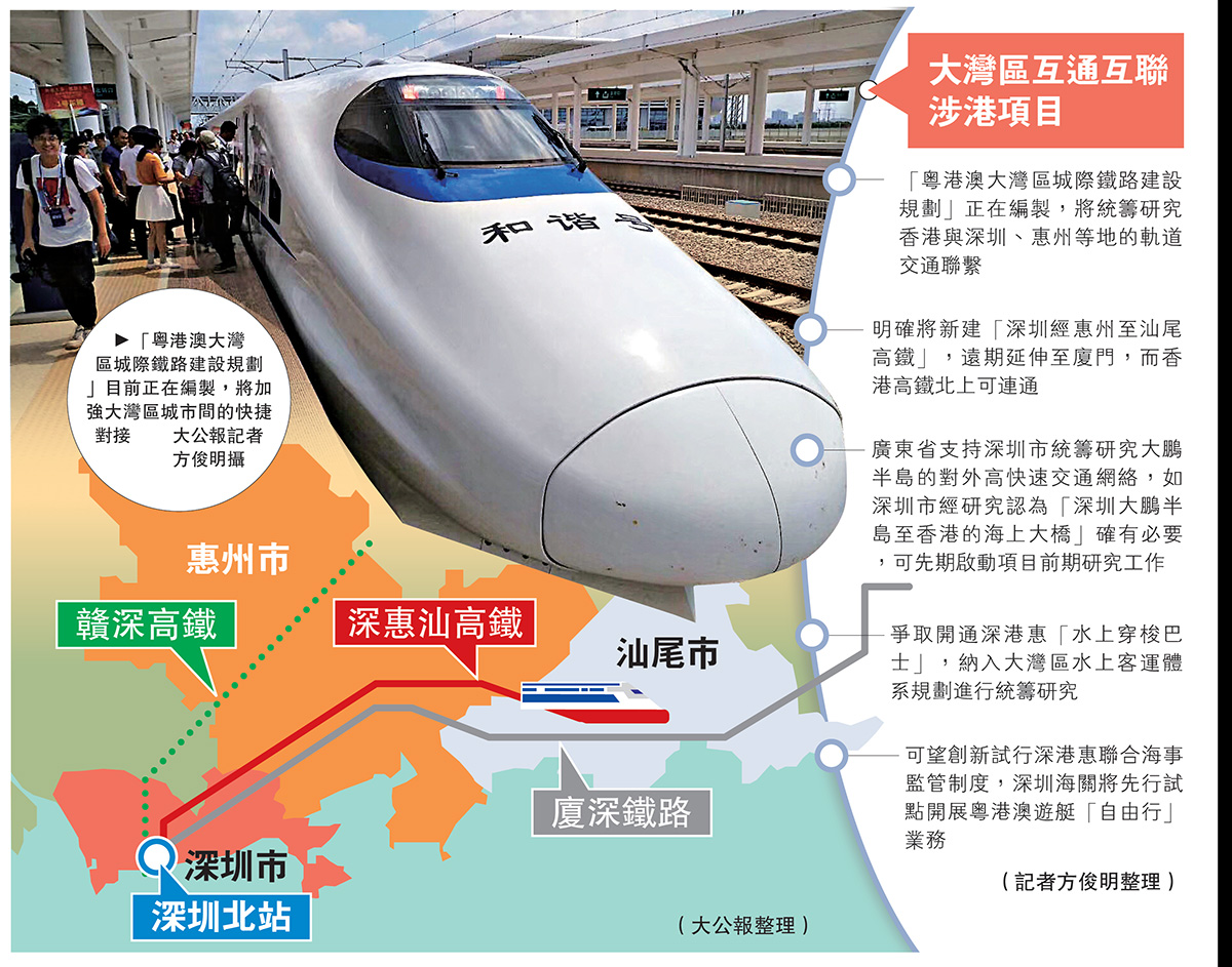 粵港澳大灣區正在加速建設。記者12日從廣東省發改委及省交通廳等部門,針對省人大代表關於「在粵港澳大灣區下推動深港惠互通互聯的建議」答覆函獲悉,「粵港澳大灣區城際鐵路建設規劃」目前正在編製,以進一步加強大灣區城市之間的交通快捷對接;同時,在深港惠地區加快構建「海陸空」立體交通體系,包括明確新建深惠汕高鐵,擇機研究深圳大鵬半島至香港海上大橋等項目。/大公報記者 方俊明廣州報道