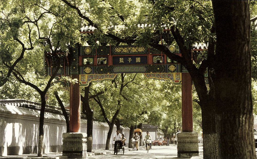 現存北京國子監位於東城,元明清三朝沿用六百多年,至今已有七百三十多年歷史。落成於元成宗大德十年(一三○六年),依據「左廟右學」古制,與東鄰京城孔廟並列建立。如今不少高考考生,考試前後還專誠到廟行禮。正門外東西街叫「成賢街」,街的東西兩端各建莊嚴牌樓一座。進入街裏不久就是「下馬碑」:「官員人等至此下馬」,必須對文化、孔夫子保持敬意。