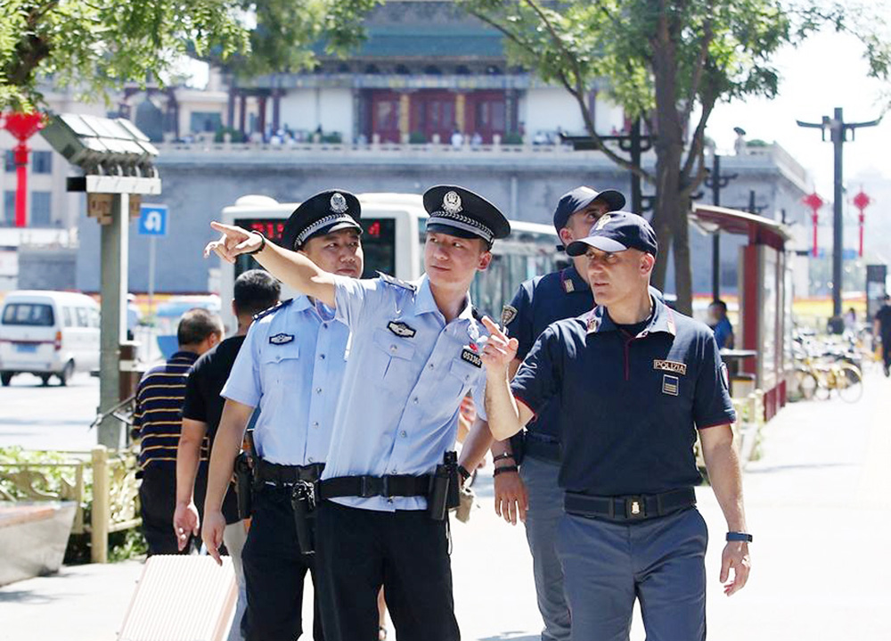 圖:意大利警察(右)與西安民警在西安街頭聯合巡邏/大公報攝