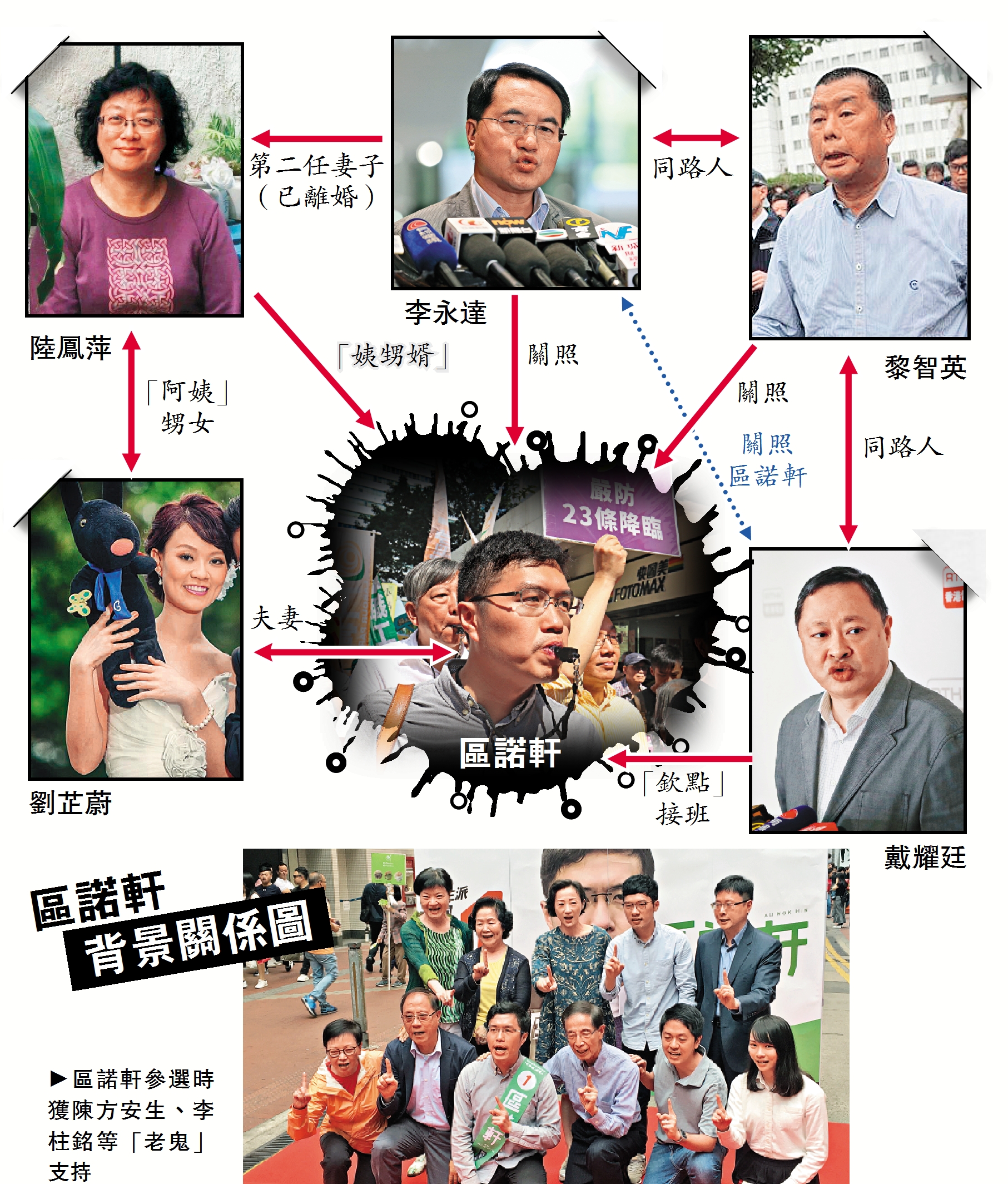 這位陸鳳萍原來是李永達的前助理,亦是李第二任妻子。就是這段隱藏關係,令區諾軒獲李永達特別關照,為其政途穿針引線,據說亦取得黎智英的「祝福」,以及「佔中」搞手戴耀廷的信任。
