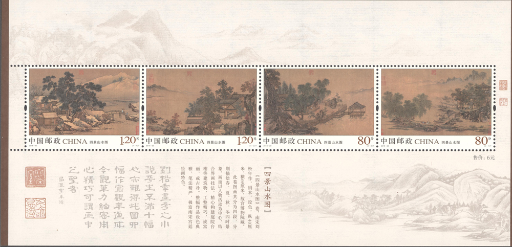 當日上午,由故宮博物院和中國郵政集團公司等共同主辦的《四景山水圖》特種郵票首發式暨「2018集郵周」啟動儀式在北京舉行。中郵集團副總經理李丕征介紹,本套特種郵票選自故宮博物院保存的南宋畫家劉松年的傳世代表作《四景山水圖》卷的局部。他指出,希望將珍藏於故宮的國家寶藏通過郵票展示,讓人們近距離地感受到中國優秀傳統文化的魅力。