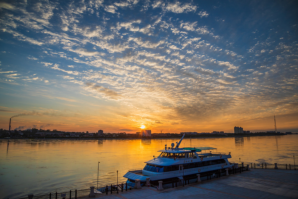 「叮」,我急忙走進電梯,歸心似箭,卻不是要回房間睡覺,而是想拍下這次日出。一進房門,拿起外套、相機、腳架,我便急步走出酒店門口。不足五分鐘,我到達黑龍江邊,四野無人,只有上漲的河水急流聲。經昨日一場滂沱大雨,天色明顯清了,不再是處處厚雲。