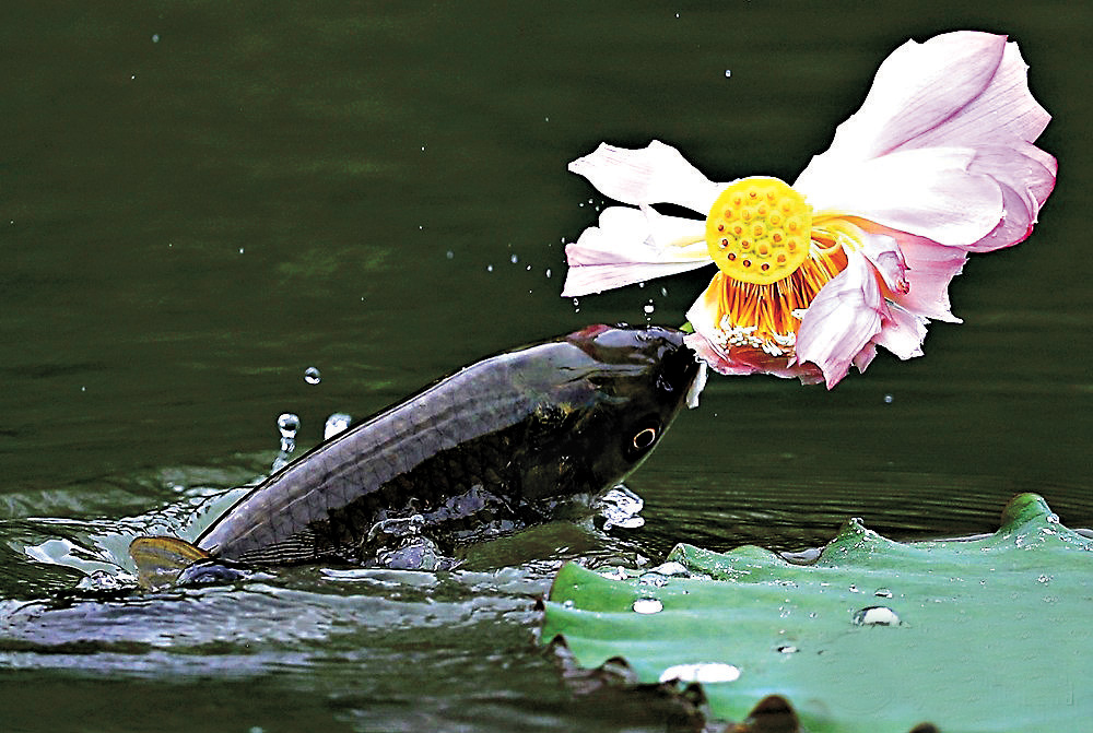 近日,四川成都郫都區攝影協會嚴建國在成都工業學院「九洲湖」拍下了一組草魚撕咬湖中荷花花瓣的圖片,這組《魚吃荷花》圖一經發布,便在網上點擊率破百萬。