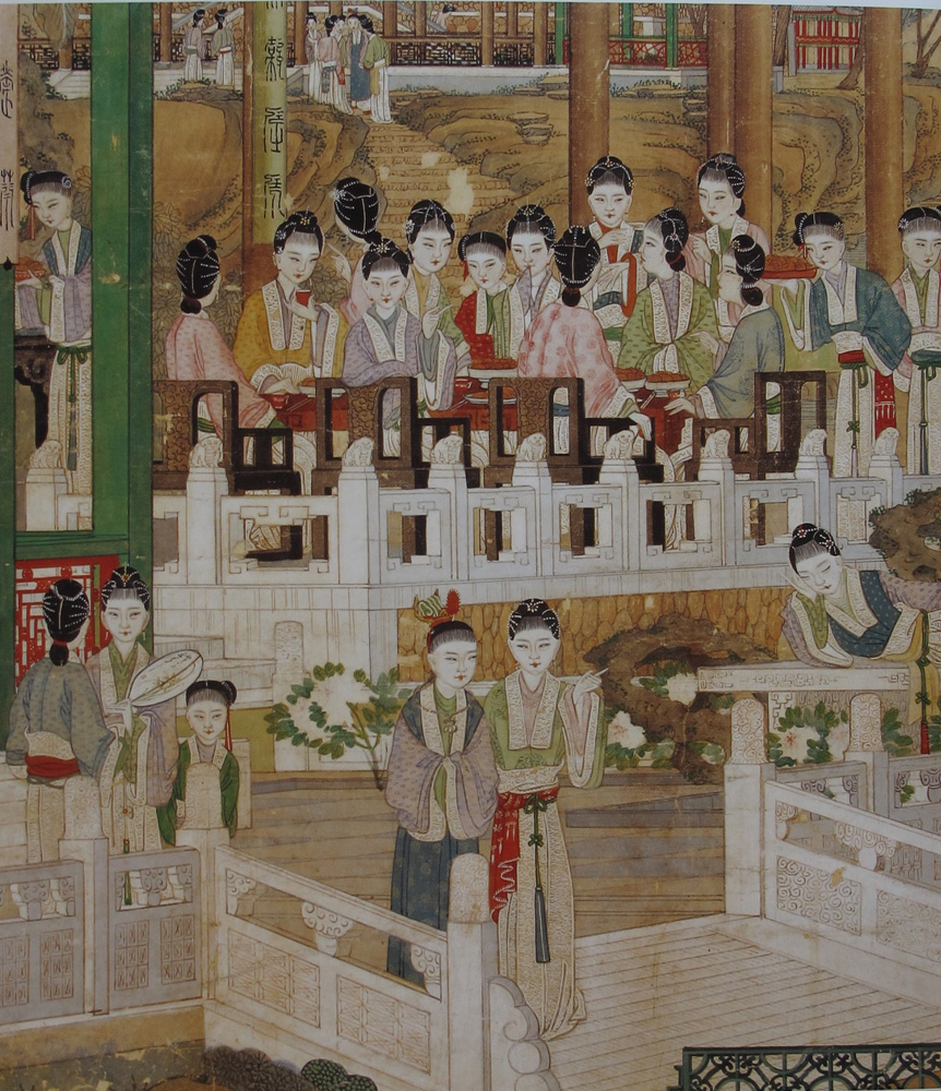 這兩部繪畫內容相同、畫風接近,長春宮壁畫繪製更精美些,技法也更熟練。筆者認為它應是在清宮如意館畫師主導下繪製的。清宮內廷書畫創作機構叫「如意館」,在乾隆時期達到極盛,後來國家內憂外患,至道光以後沉寂下來。一八六○年英法聯軍入侵北京後,至一八九四年甲午戰前,其間三十多年裏,北方時局稍微穩定一點,當政的慈禧太后喜歡繪畫,於是在故宮北五所重整如意館,「畫工皆蘇州人」(夏仁虎《清宮詞》)。長春宮《紅樓夢》壁畫有顯著的清代宮廷繪畫特點,都是供奉如意館的蘇州畫師們畫好底稿,而由彩畫師畫在牆壁上。