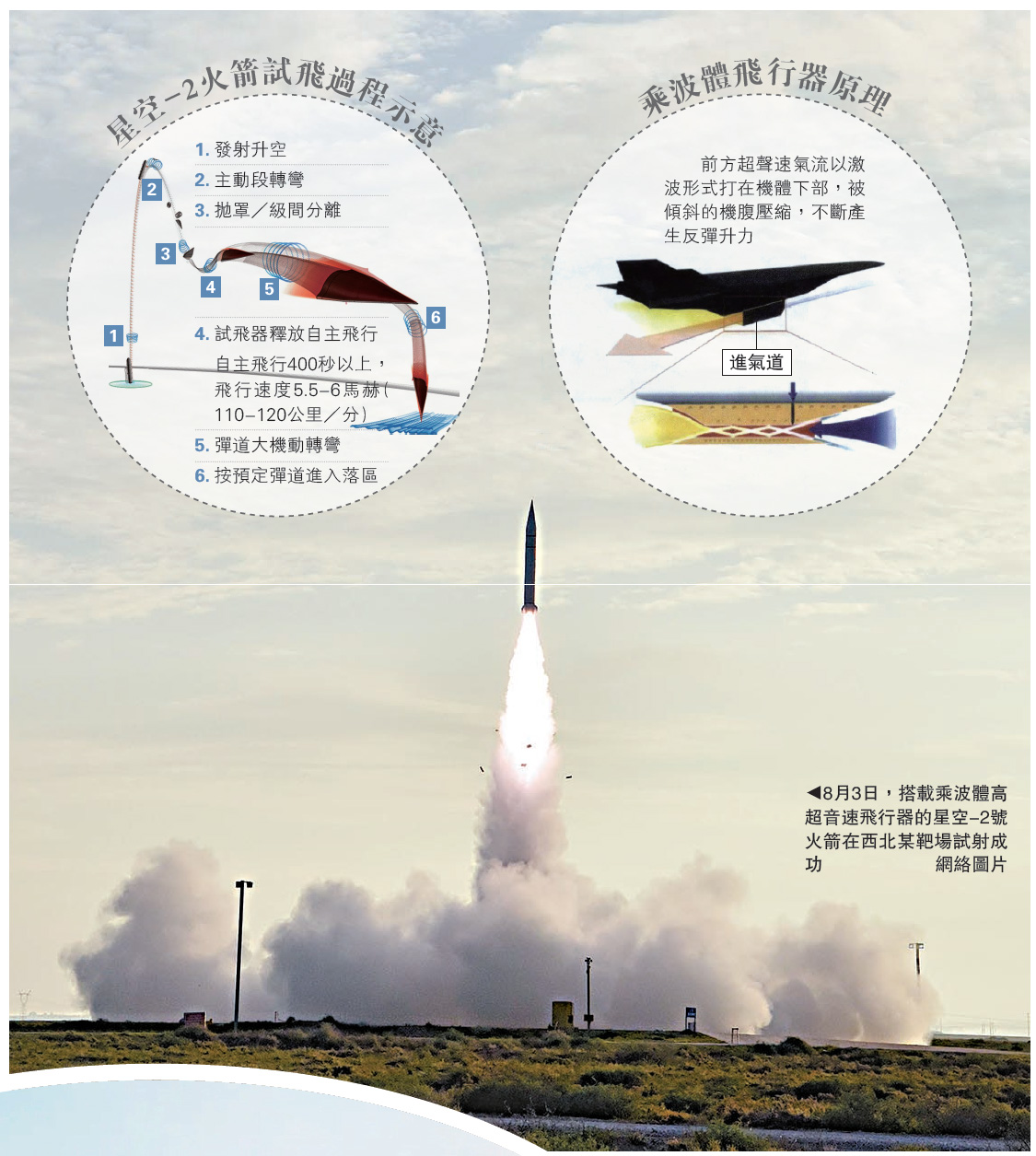 圖:8月3日,搭載乘波體高超音速飛行器的星空-2號火箭在西北某靶場試射成功/網絡圖片