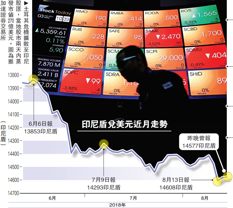 土耳其危機擴散至印尼股匯,當地股市兩天內蒸發市值270億美元(約2106億港元),印尼盾亦曾跌至三年低位;為遏止其貨幣下跌,印尼央行出乎意料加息四分一厘。土耳其銀行業監管機構周三宣布外匯交易措施,土耳其里拉兌美元一度反彈9%,惟其後倒跌2.8%。/大公報記者 鄭芸央