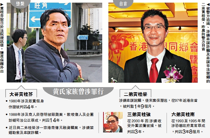【大公報訊】記者周慶邦報道:捲入跨境億元騙案的「犯罪家族」大哥黃桂芬,保釋期間墮樓身亡。黃桂芬被控以一項串謀詐騙罪,前日於法院應訊提堂後,獲准以100萬元保釋外出。詎料五個多小時後,他被發現在油麻地停車場墮下身亡,身上懷有四封遺書,內容大意指「對唔住家人,唔想再玩,感到將來冇希望。」警方調查相信事件無可疑。至於同案被警方追緝、涉嫌串謀詐騙及串謀非法禁錮的二弟黃桂榮,即於昨晨向警方自首。