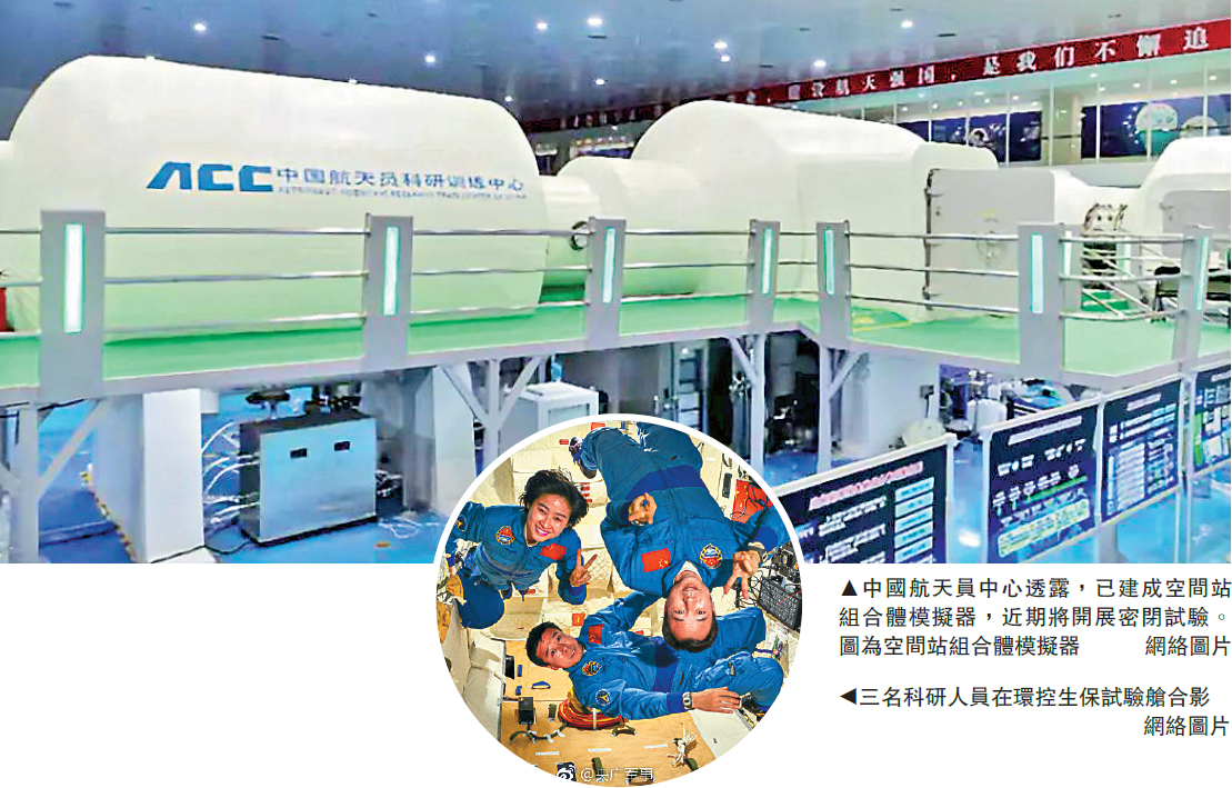 中國預計在2022年建成首個太空站,並在軌運行至少10年。中國航天員科研訓練中心的最新消息顯示,該中心自主研製的太空站組合體模擬器即將投入試驗運行。3名科研人員將開展為期52天的密閉試驗,其中最重要的任務是檢驗太空站環控生保分系統的運行情況。這一系統大量使用新型複合材料,關鍵技術攻關已順利完成。/大公報記者 劉凝哲北京報道