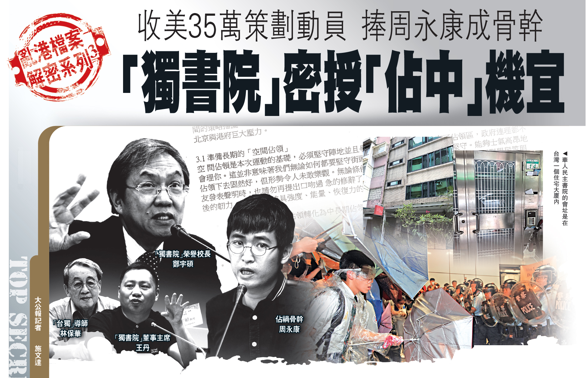鄭宇碩任榮譽校長的華人民主書院2011年5月在台北成立,在香港及美國設辦事處,收受美國資金35萬港元推「佔中」前期策劃。《大公報》獲得華人民主書院的內部文件顯示,這個以推動「港獨」、顛覆中國為己任的「獨書院」透過網絡課程召收會員,荼「獨」兩岸三地青年。/大公報記者 施文達