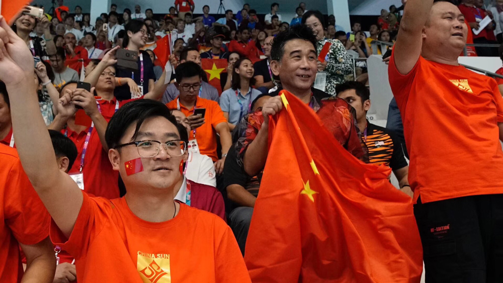 圖:吳國平(中間持國旗)在現場為孫楊加油助威 受訪者供圖