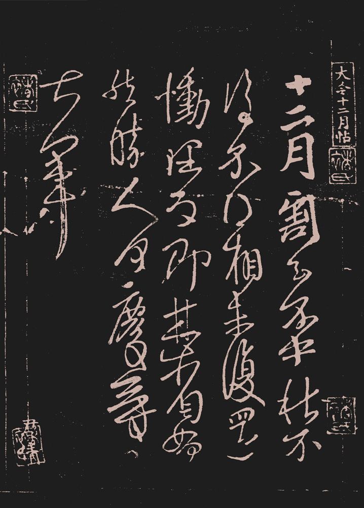 將《寶晉齋法帖》所刻王獻之《十二月帖》與《中秋帖》相較,可見二帖文辭多同,只是《中秋帖》略去「十二月割至不」、「未複」、「慟理」諸字。另外,二帖書法有很大程度的相似處,亦有微妙的不同處。