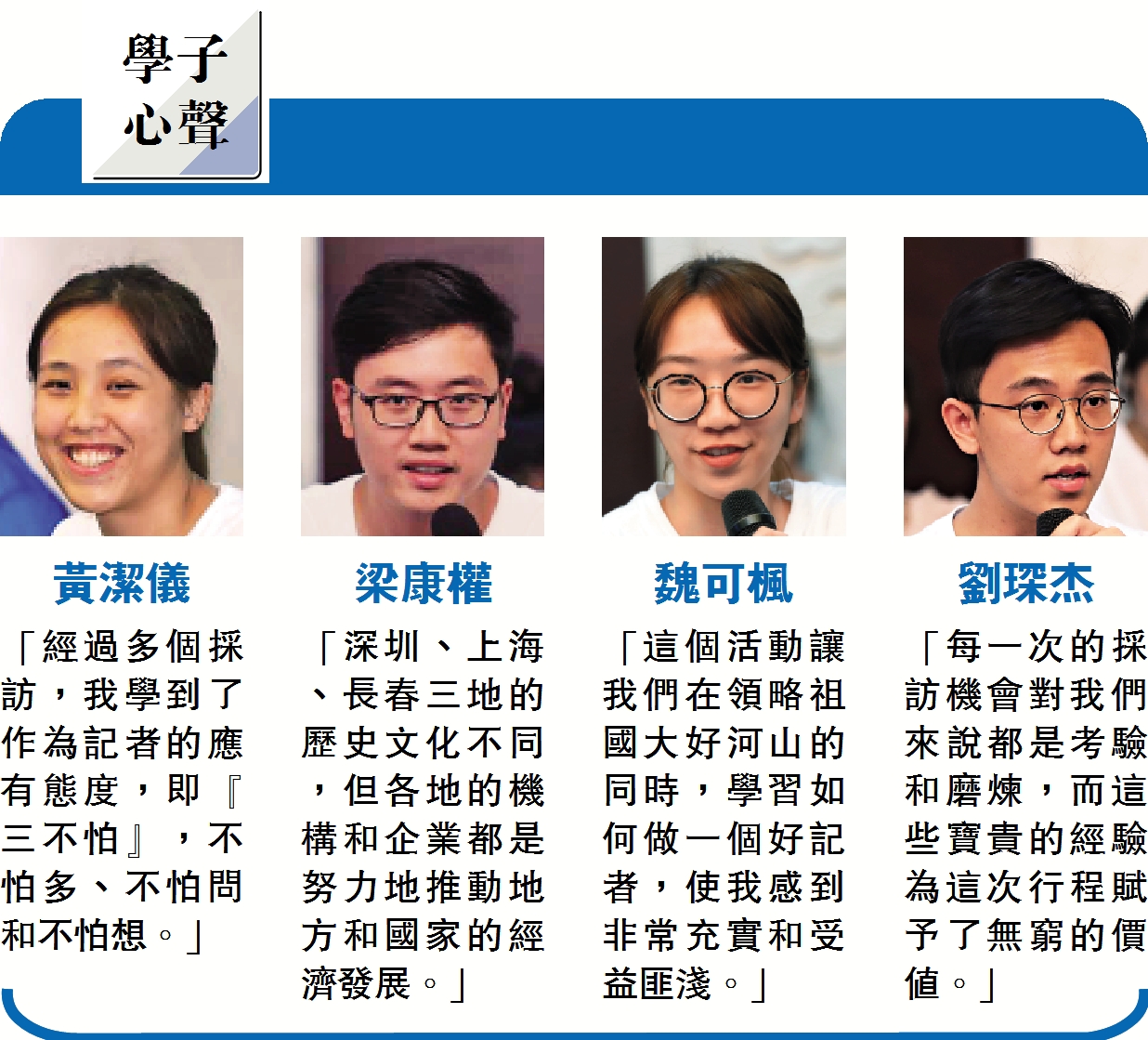 同樣來自香港樹仁大學的梁康權表示,深圳、上海和長春三地的歷史文化不同,卻深刻感受到當地機構和企業在努力推動地方和國家的經濟發展。是次活動還讓他了解到記者的工作,學會如何採訪、寫稿,使他有不一樣的旅程體驗。