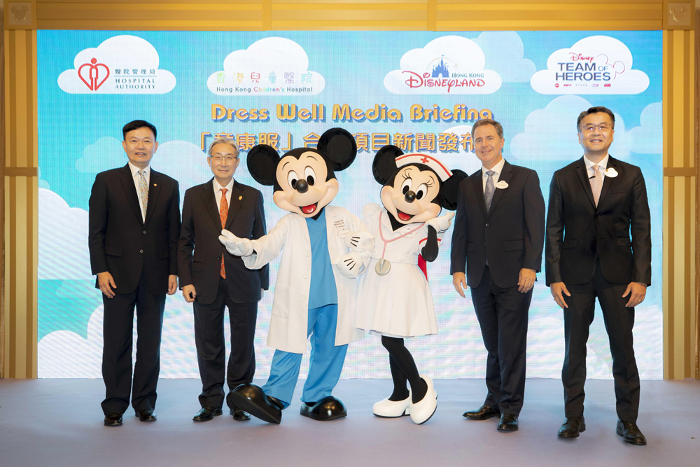 圖:醫管局主席梁智仁(左二)、香港迪士尼樂園度假區行政總裁劉永基(右一)與嘉賓出席「童康服」合作項目發布會