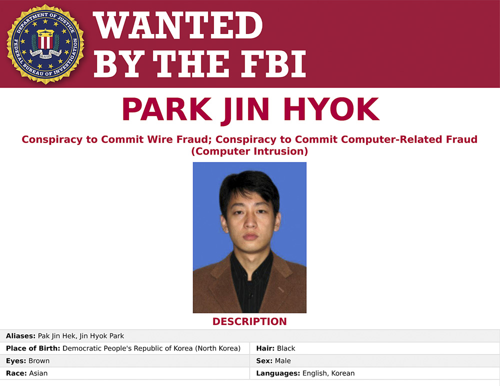 圖:美國司法部6日起訴朝鮮黑客朴鎮赫,FBI發出通緝令,認為其正在朝鮮\美聯社
