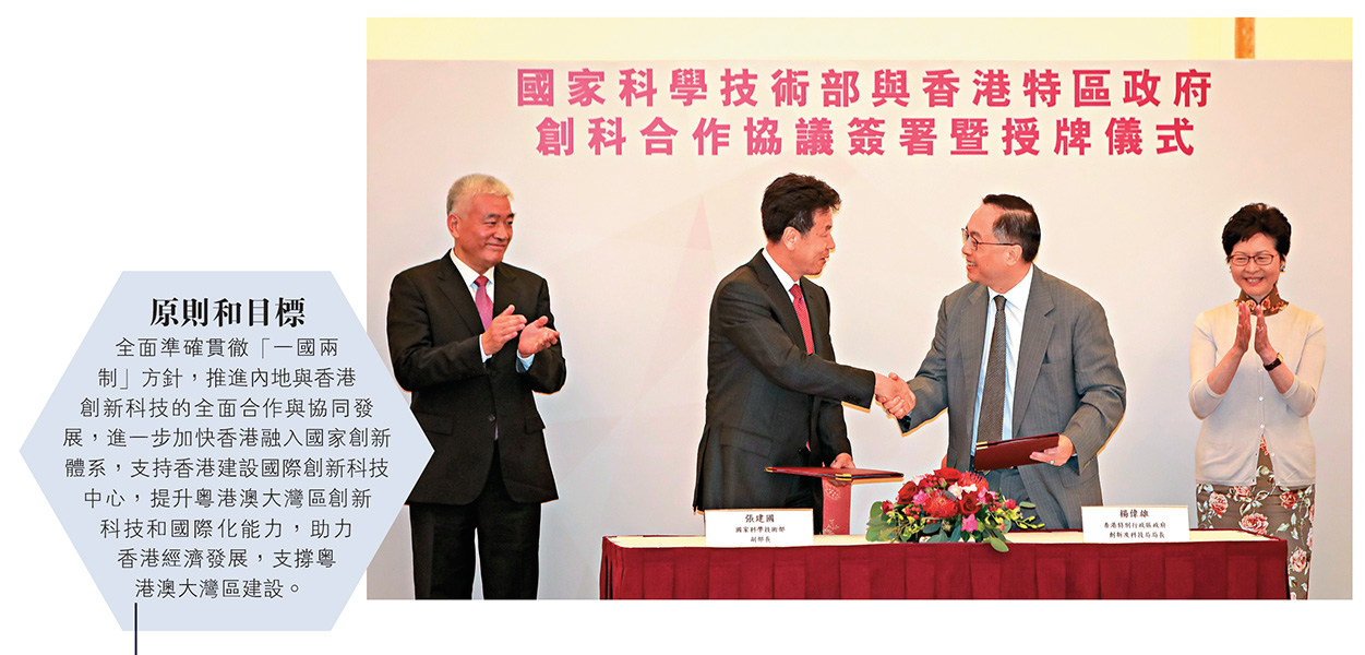 林鄭月娥昨日在創新及科技局局長楊偉雄、政制及內地事務局局長聶德權和行政長官辦公室主任陳國基陪同下,與王志剛在禮賓府會面,其後舉辦簽署儀式。中聯辦副主任譚鐵牛、多名在港兩院院士、六間大學校長,以及香港科技界代表擔任嘉賓,共同見證由楊偉雄、國家科技部副部長張建國簽訂《內地與香港關於加強創新科技合作的安排》,以及創科局常任秘書長卓永興及國家科技部港澳台辦公室主任葉冬柏,簽訂《科學技術部與香港特別行政區政府創新及科技局關於開展聯合資助研發項目的協議》。