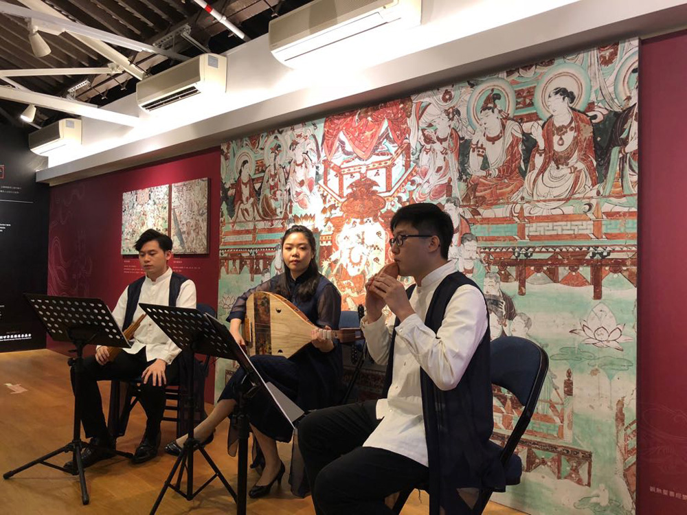 圖:天籟敦煌樂團副團長陳韻妍(中)及團員於「天籟敦煌.淨土梵音」展廳演奏敦煌古曲 受訪者供圖