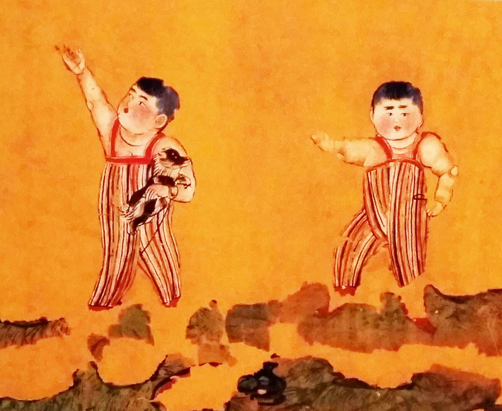 絹畫大小為五十八點八厘米乘四十七點三厘米,一九七二年出土,是唐朝年間(公元六一八至九○七年)的畫作。唐朝的唐繪,除紙材之外,就以絹畫著稱。此畫中人是在戶外嬉戲的兩個兒童,他們白白胖胖,雙目光亮,面若桃花,袒露上身,穿的吊帶彩色間條長褲,看似現代工人長褲,是當時波斯流行童裝。二童腳踏紅鞋。昔日敦煌有如今日香港,華洋雜處,繁榮昌盛,長安和洛陽的街頭上,漢人穿胡服的大不乏人。畫中左邊兒童右手抬高,打開手掌,似放掉掌中飛蟲;左手抱捲毛黑白相間小狗,小狗凝望旁邊另一個兒童。另一個兒童則緊皺眉頭,定睛注視,似有所發現。寵物小狗高六寸、長尺餘,機靈聰慧,唐朝時稱為「拂菻」狗,即如今的哈巴狗,其故鄉是在唐朝被稱為「大秦」或「拂菻」的東羅馬帝國。古稱高昌的吐魯番,地處古絲路要衝,高昌王有拂菻狗,他曾向唐王朝獻過雌雄拂菻狗各一頭。由於是貢品,此狗身價倍增,能擁有牠的人也非富則貴。兩童前面的地上,有岩石和小草,敷染赭石和青綠色,乃是唐朝山水畫常見的青山綠水貌。《雙童絹畫》出土自阿斯塔那墓群,這墓群是西晉至唐朝的貴族墓地,位於新疆吐魯番市。由於高昌乾燥,絹畫因而能保存得頗為完整。
