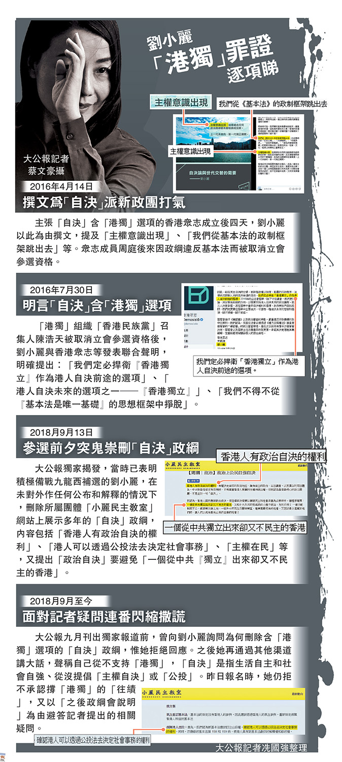大公報上月刊出「揭發劉小麗鬼祟刪政綱」的獨家報道前,曾向她詢問刪除的原因,惟她拒絕回應。之後劉小麗卻通過其他渠道,以「大話冚大話」,聲稱自己從不支持「港獨」、「自決」是指生活自主和社會自強、從沒提倡「主權自決」或「公投」,企圖開脫。