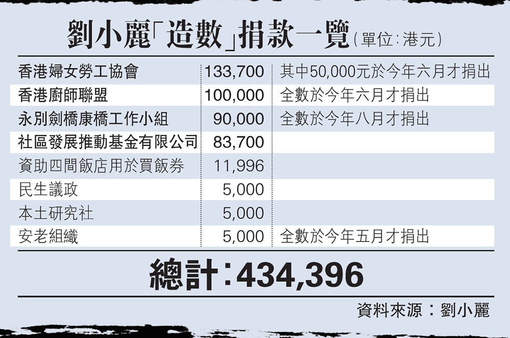 前年立法會選舉期間劉小麗告急,公開承諾當選後每月會捐出議員人工的一半給社區團體,成立「家務義工隊」幫助長者,又稱會公布帳目。劉小麗早前刻意向友好傳媒展示所謂捐款紀錄(無單據證明),稱從前年10月起至今年八月,已陸續向11個勞工組織、社企,及民間團體,捐出等同於九個月立法會議員薪金的一半,即43.4萬港元(詳見表)。