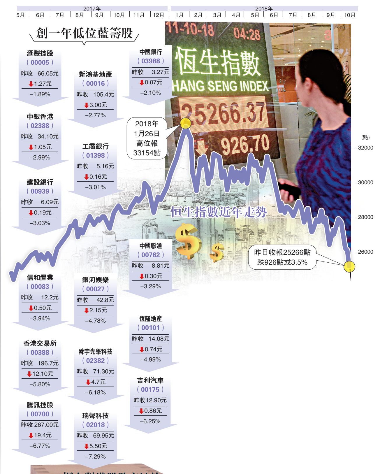 貿易戰以及美債息上升等不利股市的因素,一直未見有改善,美股最終無力再上,再次出現自今年2月以來大幅度的調整。投資者對投資環境的憂慮蔓延至亞洲市場,連日積弱的港股開市已裂口低開800點,同時由於道指期貨未有止跌跡象,令港股持續下跌最多1067點,至下午三點A股收市後,跌幅有所收窄,收報25266點,創去年5月19日以來收市新低。大市昨日下跌股份比例達95%;上升股比例僅5%;而且全日成交高達1397.44億元,反映沽壓沉重。另外,國企指數曾穿一萬關,低見9975點,收報10092點,跌350點或3.4%。