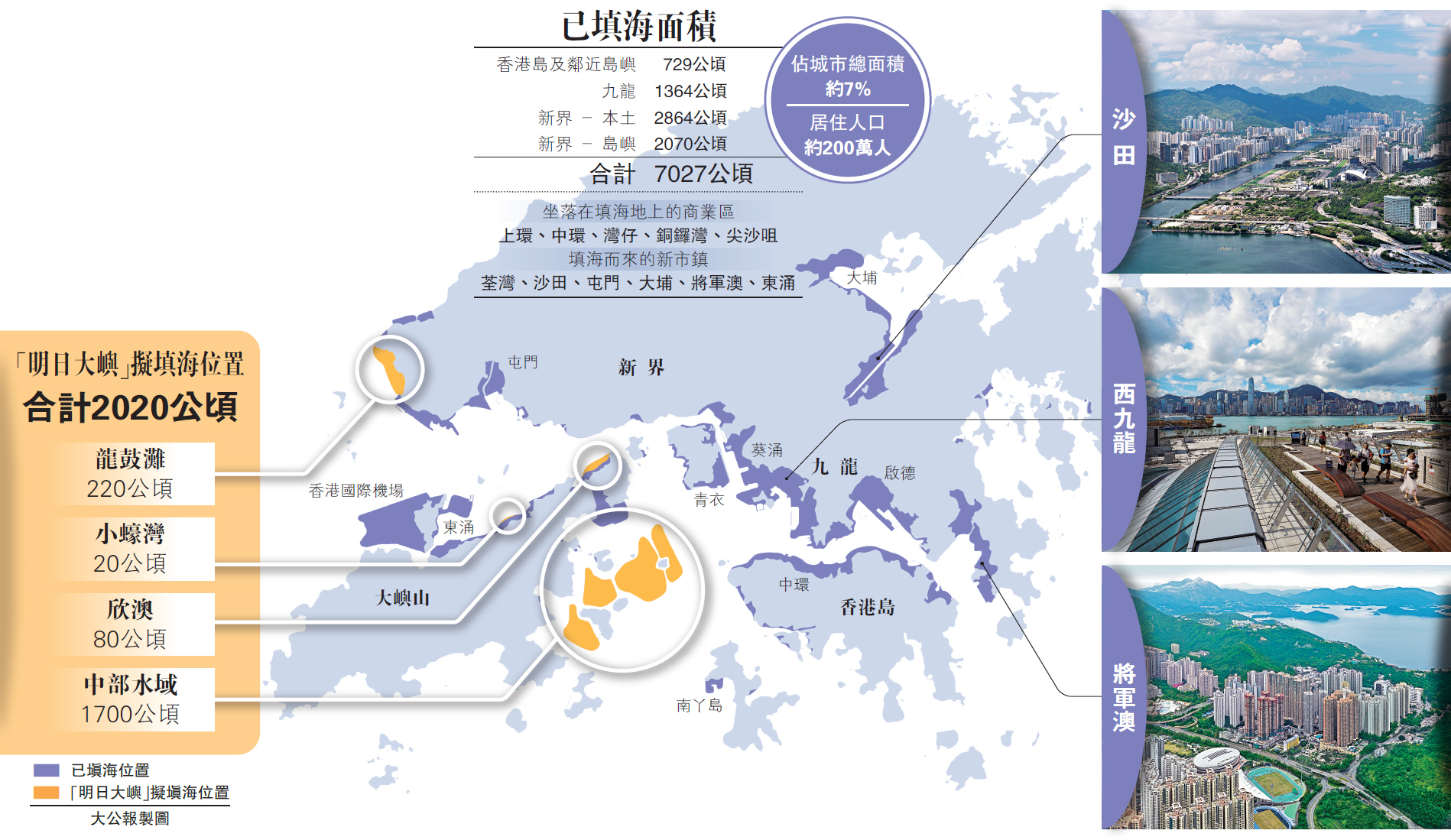 為紓解香港的住屋困局和促進經濟發展,行政長官林鄭月娥在新一份施政報告提出「明日大嶼願景」,在東大嶼填海1700公頃,惟反對派拋出「掏空庫房」等理由盲反。有專業人士表示,「明日大嶼」人工島可帶來逾6000億元的賣地收入,扣除填海費用可賺多過千億元,所謂掏空庫房絕非事實;亦有議員強調,香港的發展正是一個填海而來的故事,百多年來填海得來的土地已達逾7000公頃,約200萬人口因而得享安居,所以填海絕對是解決今日香港人居住問題的長久之計。/大公報記者 朱晉科 楊州